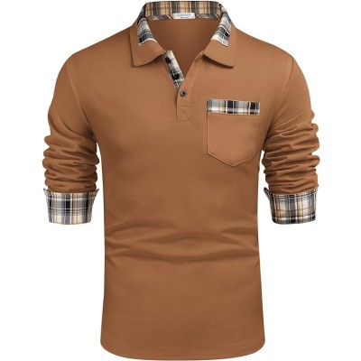 Men's Casual Long Sleeve Plaid Collar Polo Shirt with Pockets
