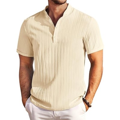 Men Casual Henley Shirt Short Sleeve Band Collar Summer Beach Textured Shirts