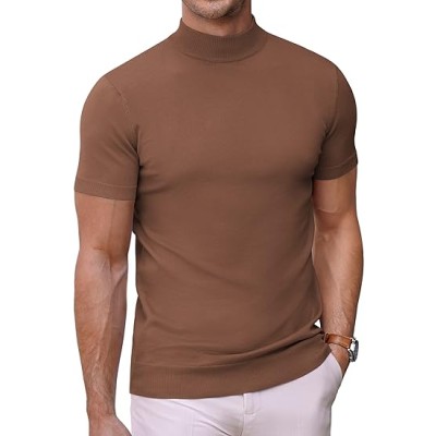 Mens Mock Turtleneck Sweater Short Sleeve Solid Color T-Shirts Basic Slim Fit Knitted Pullover Tees