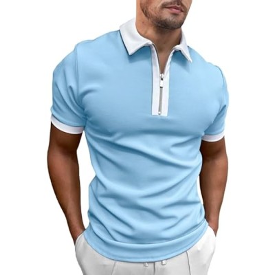 Mens Knit Polo Shirts Quarter Zip Shirts Casual Stripe Classic Lightweight Short Sleeve Golf Collared Shirt