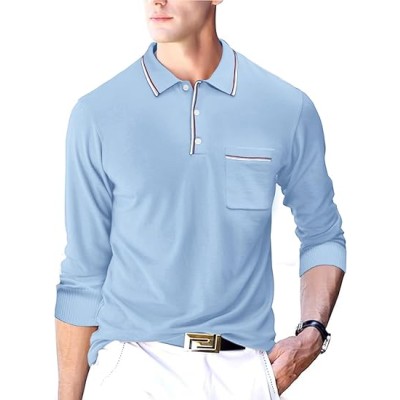 Mens Polo Shirt Classic Regular Fit Long Sleeve Color Block Golf Shirts